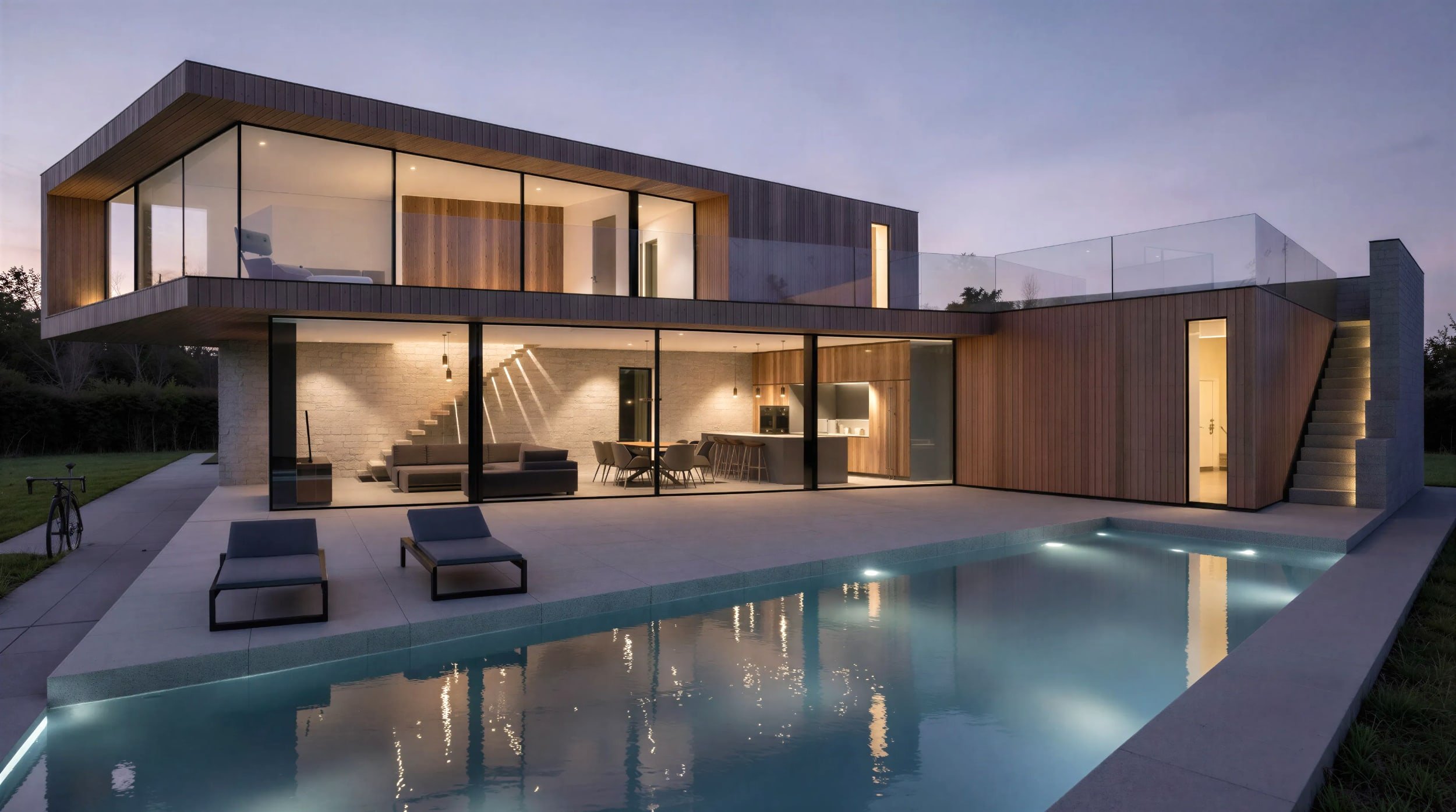 This design explores dynamic spatial relationships through offset volumes and strategic glazing placement. The cantilevered first floor creates covered outdoor space below whilst full-height curtain walls connect living areas with landscape views. The angular geometry generates visual interest without compromising practical functionality.